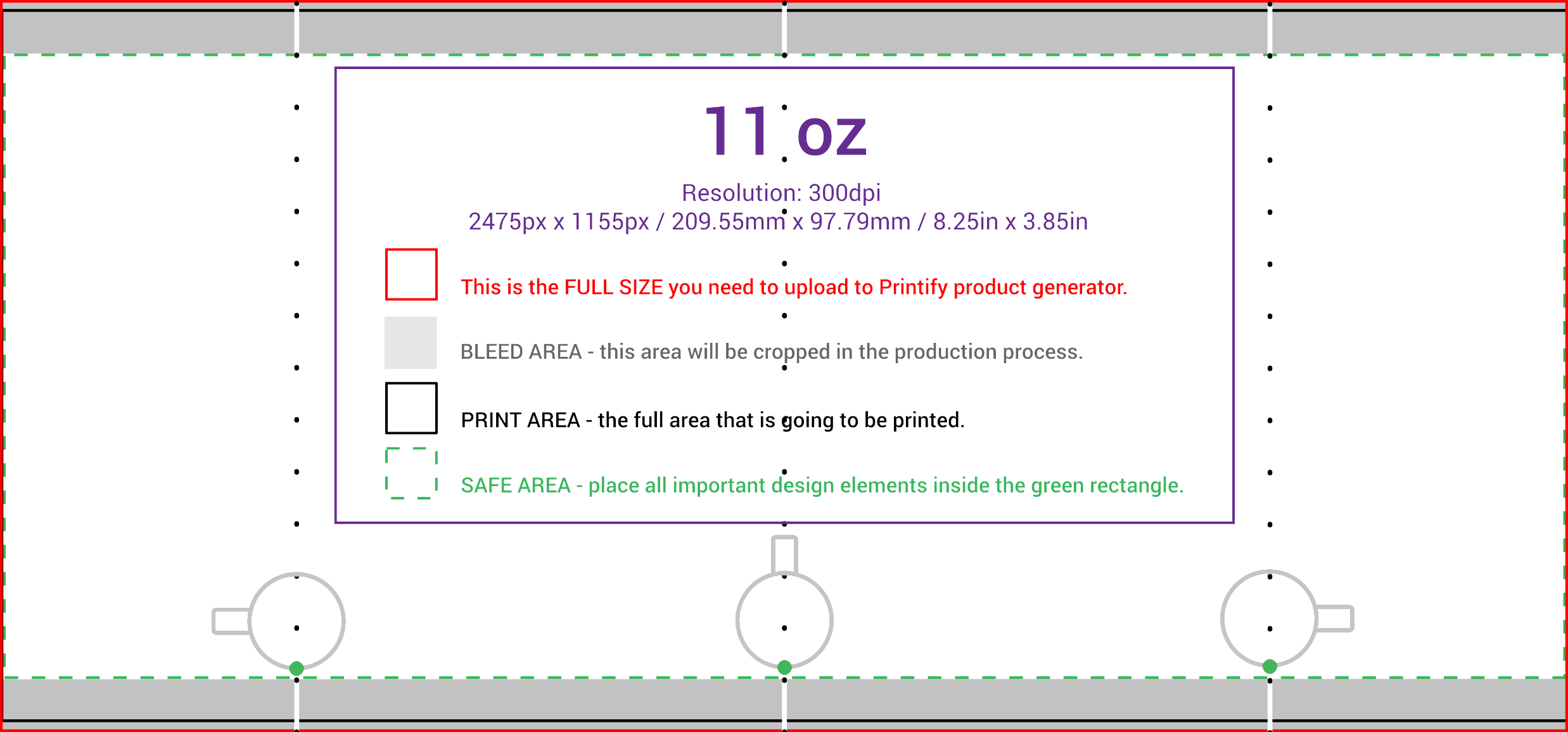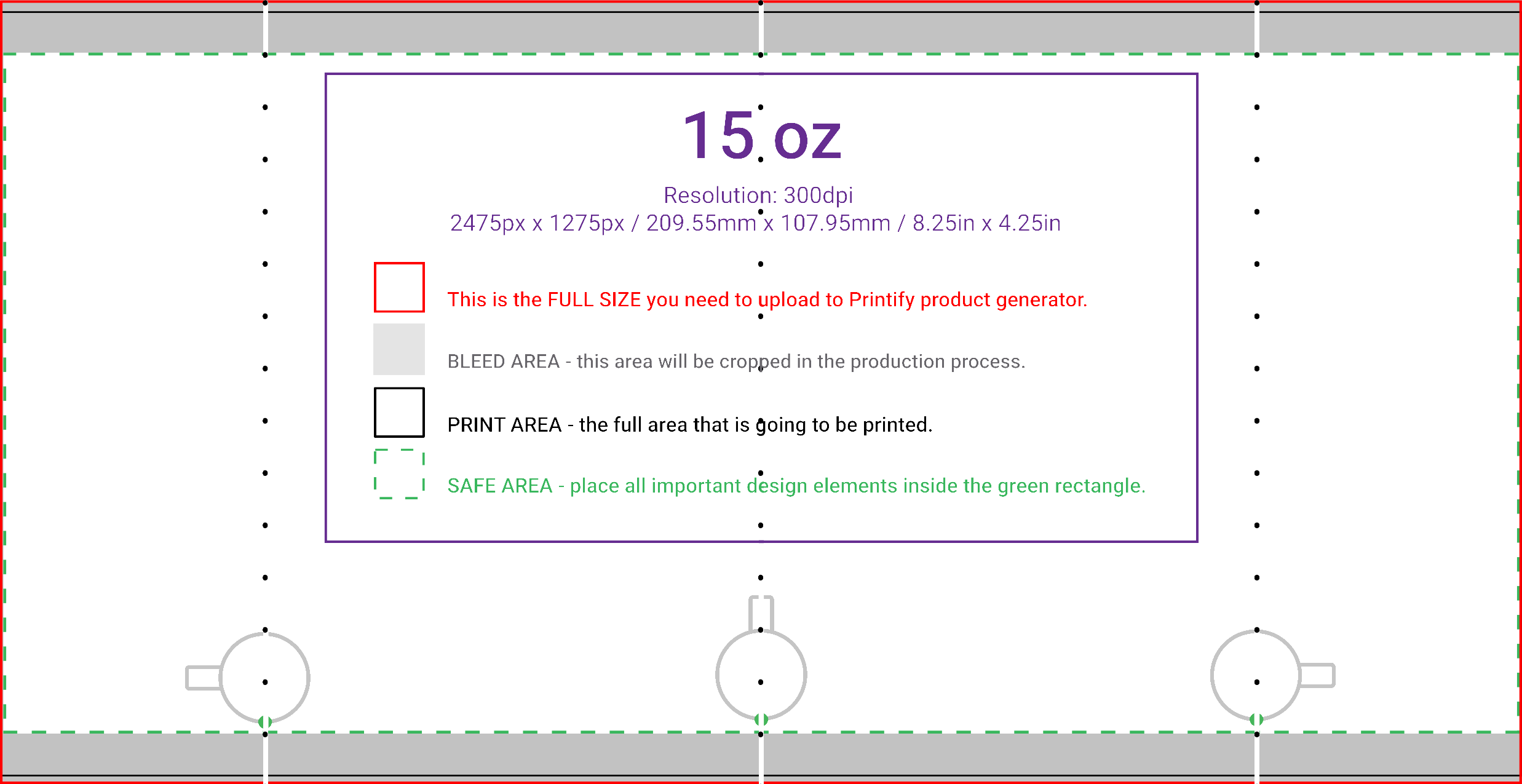 Please make sure your design covers the entire print area. This includes the bleed area (marked in gray on the product gallery images). Otherwise, the sides of your product might be left blank. Important design elements should remain within the safe area (marked with dashed line on the product gallery images) as they might be cut-off if left outside.