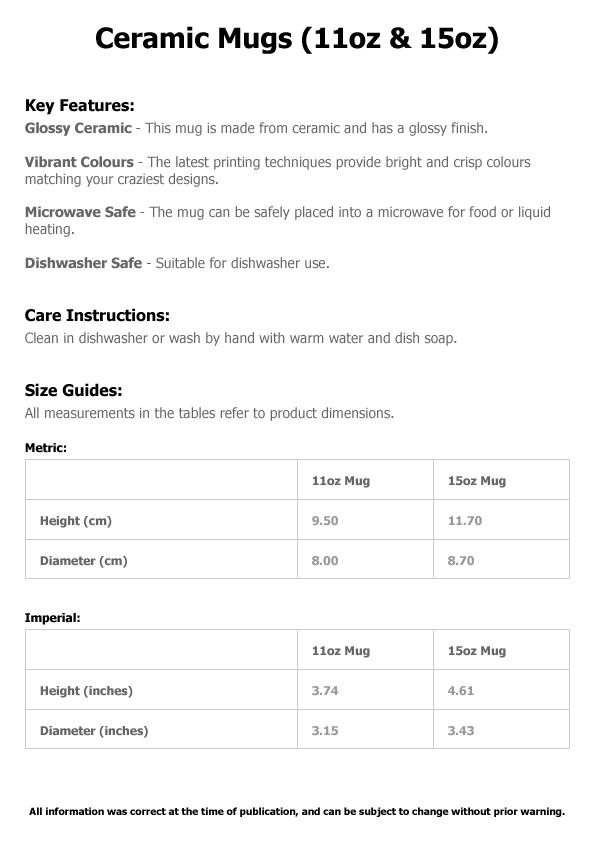 Simply choose the size you require <em>(11oz or 15oz)</em>, upload your chosen image, and we’ll expertly print it on a high-quality ceramic mug, ensuring vibrant colours and a lasting finish. Perfect for gifts, promotional items, or personal use, our bespoke mugs offer a unique way to enjoy your favourite drinks while showcasing your individuality.