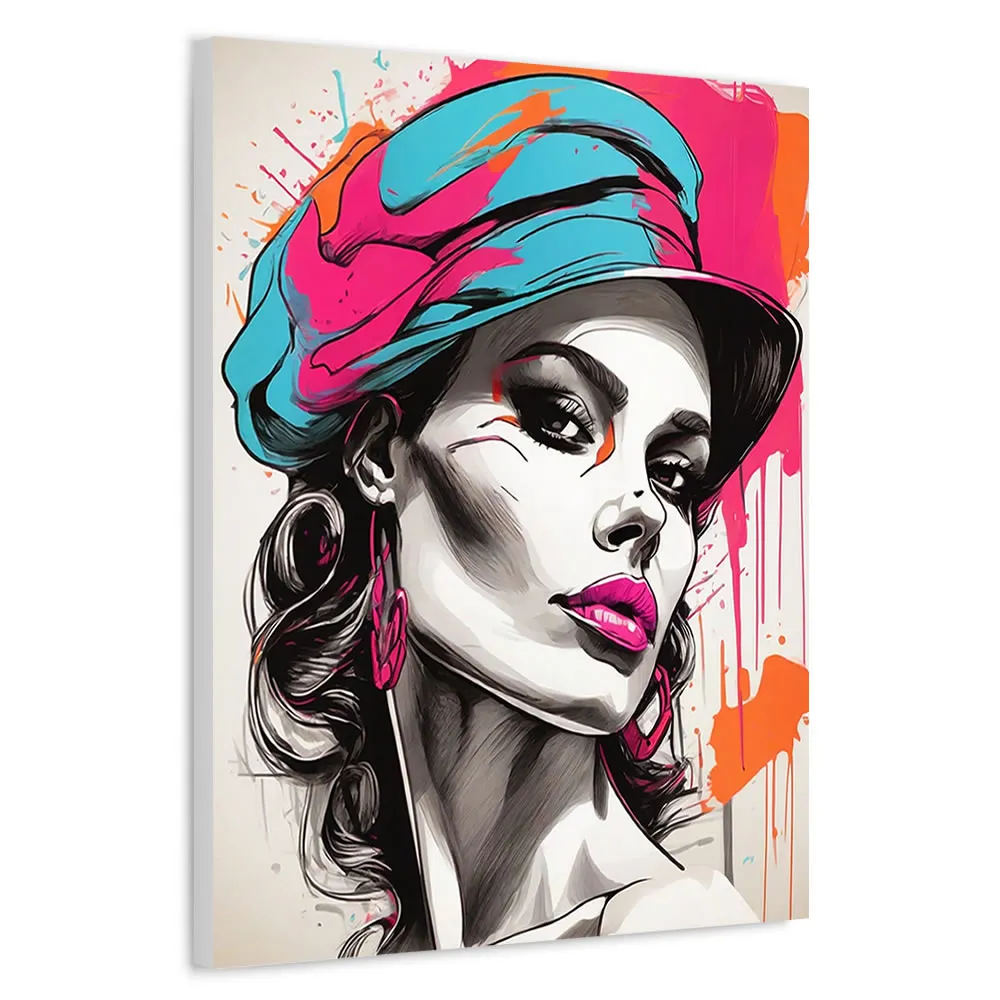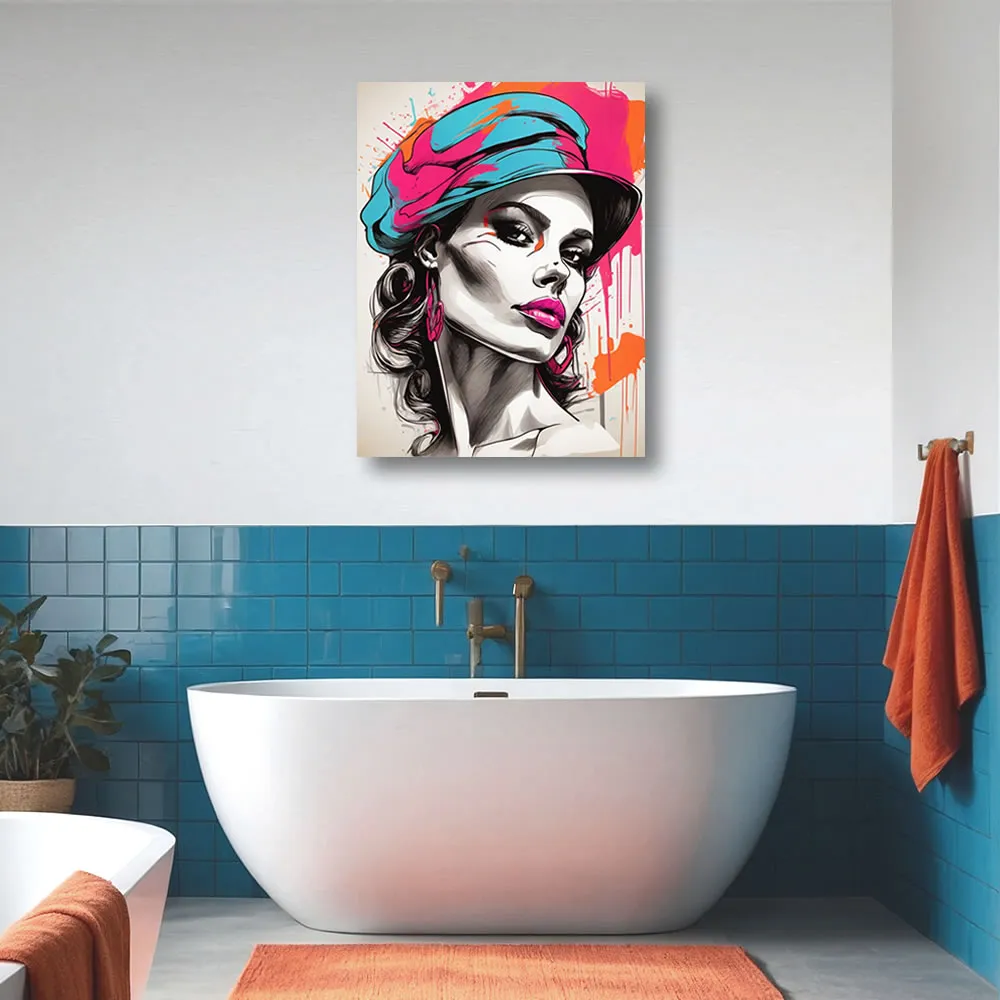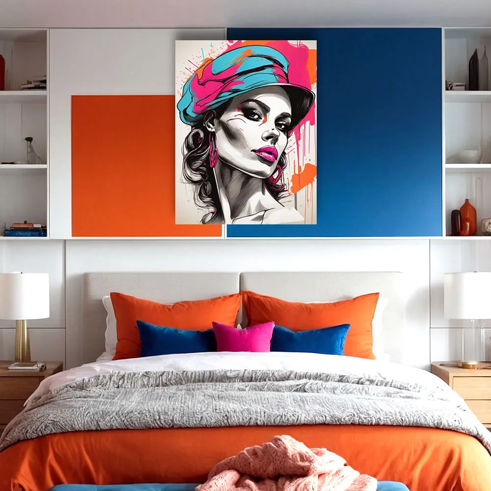 This artwork stands out with its vivid color palette, utilising shades of orange and pink to create an eye-catching contrast that highlights the subject’s intricate details and expressive features. The slightly moody expression on the lady’s face adds a layer of intrigue and emotion, inviting viewers to interpret her story and the emotions behind her gaze. The digital technique used to create this piece ensures precision and vibrancy, making each brushstroke and detail come to life on the satin canvas.