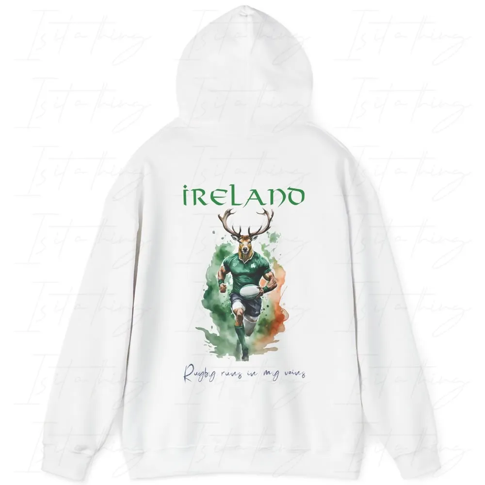 Unique Ireland “Rugby runs in my veins”, digital artist-designed white hoodie depicts the majestic and spirit of the Irish Stag.
