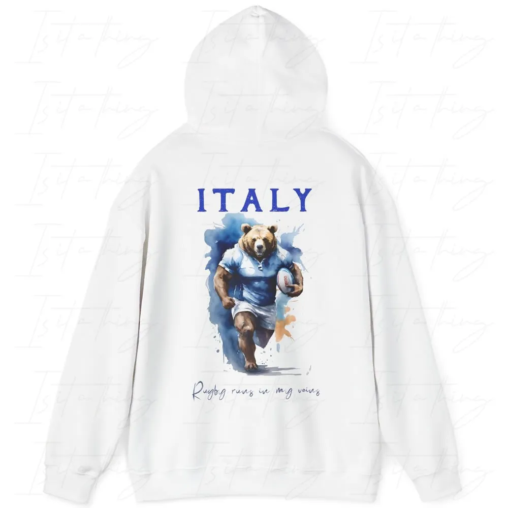 Unique Italy “Rugby runs in my veins”, digital artist-designed white hoodie featuring a digital watercolour depiction of the fast and aggressive Italian Bear.
